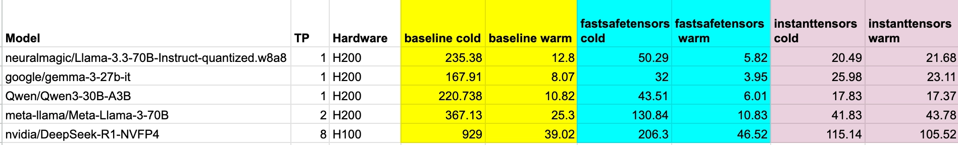 We patched instanttensors to use the io_uring API and observed that warm start latencies are now as fast as fastsafetensors while not degrading fast cold-start latencies. Table 3 shows these results, and the trend is consistent across different sized models and differently sharded models (from TP=1 to TP=8).